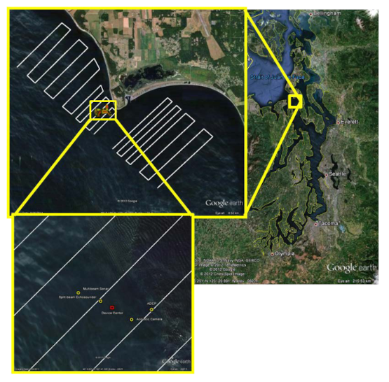 Acoustic data used in this research were collected in 2011 at a site in Admiralty Inlet chosen by the Snohomish Public Utility District for the potential deployment of two hydrokinetic turbines. Data were collected using a Simrad EK-60 echosounder operating at 120 kHz, an autonomous bottom-deployed 1MHz Nortek AWAC acoustic doppler current profiler (ADCP), and midwater trawl catches deployed from a mobile surface vessel. Acoustic and fish surveys were conducted during day and night for a combined total transect length of 28 km, where 324 parallel transects extending northwest and southeast of the proposed turbine location, were spaced 0.5 km apart. The ADCP collected concurrent tide state and tidal velocity measurements for 12 minutes every two hours. A Marinovich midwater trawl was used to capture samples to quantify species composition and length-frequencies of the fish community. Among captured species, Pacific herring represented 32% of the total catch by number. Therefore, all acoustic backscatter was attributed to Pacific herring in acoustic density calculations.